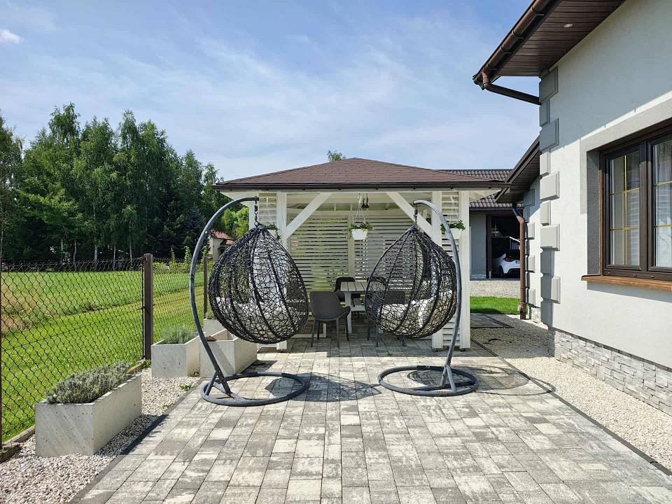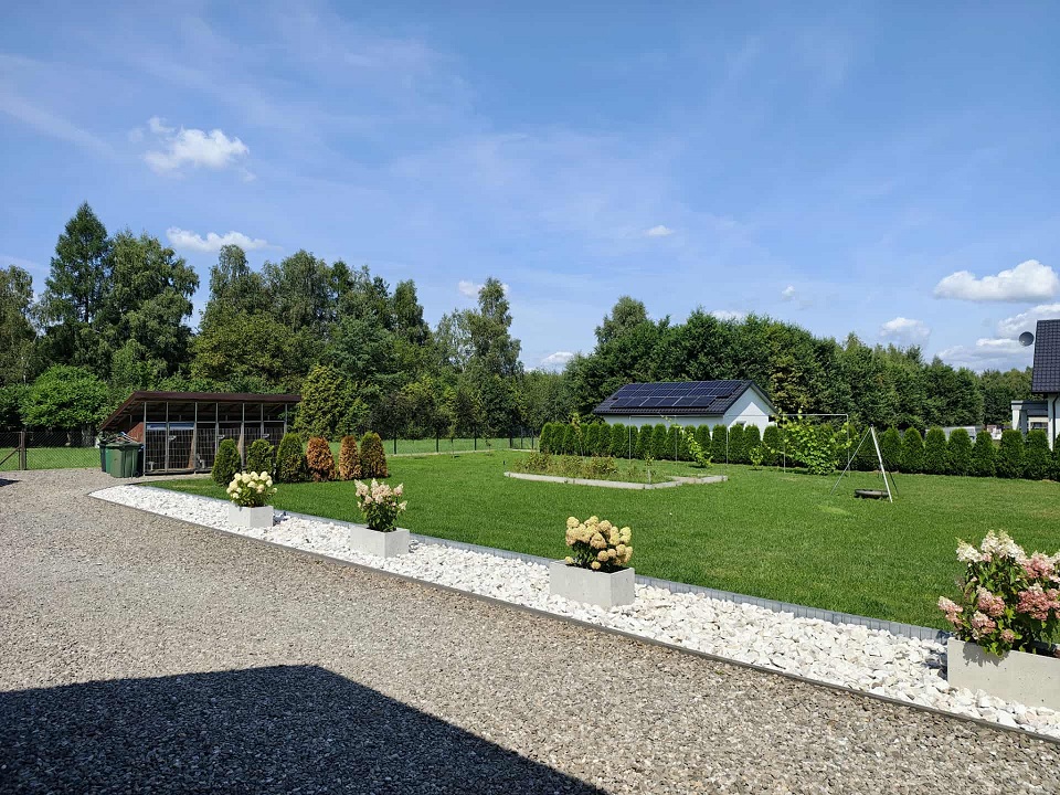 Przestrzeń dookoła domu uporządkowana i w większości zaaranżowana, z wydzieloną strefą wypoczynkową z altanką i pięknie obsadzonym bylinami tarasem, wyłożonym kostką brukową.