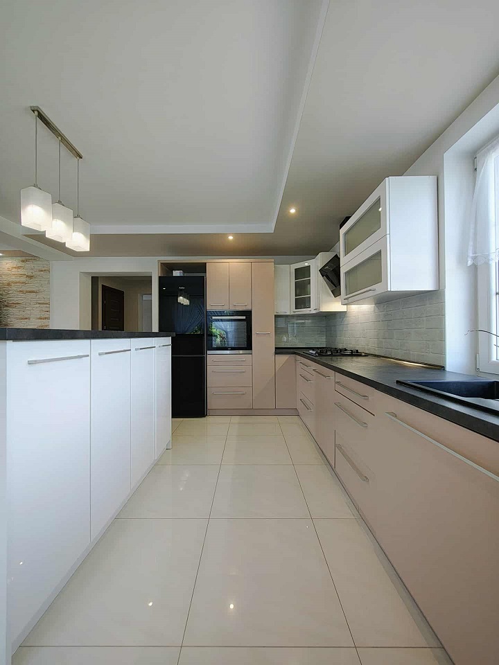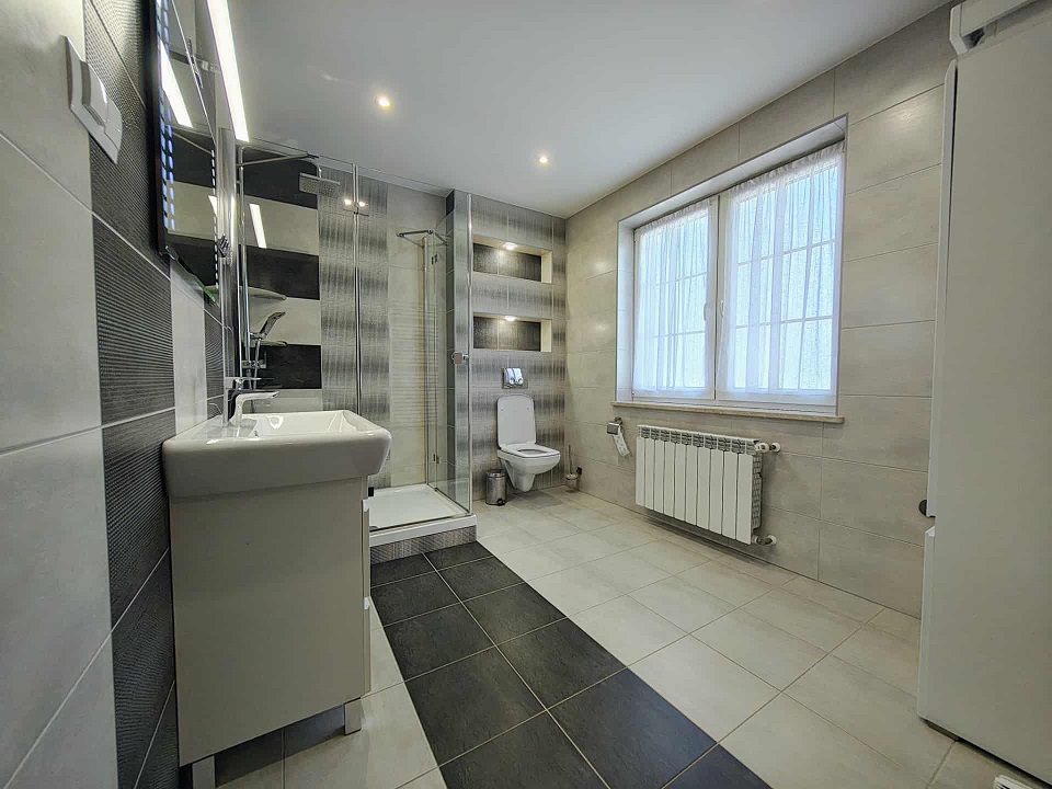 Na parterze - przestronny salon z kominkiem i wyjściem na taras, połączony z otwartą kuchnią z meblami wykonanymi na wymiar oraz szeroką wyspą, oddzielna jadalnia, łazienka z WC, wiatrołap oraz komunikacja.
