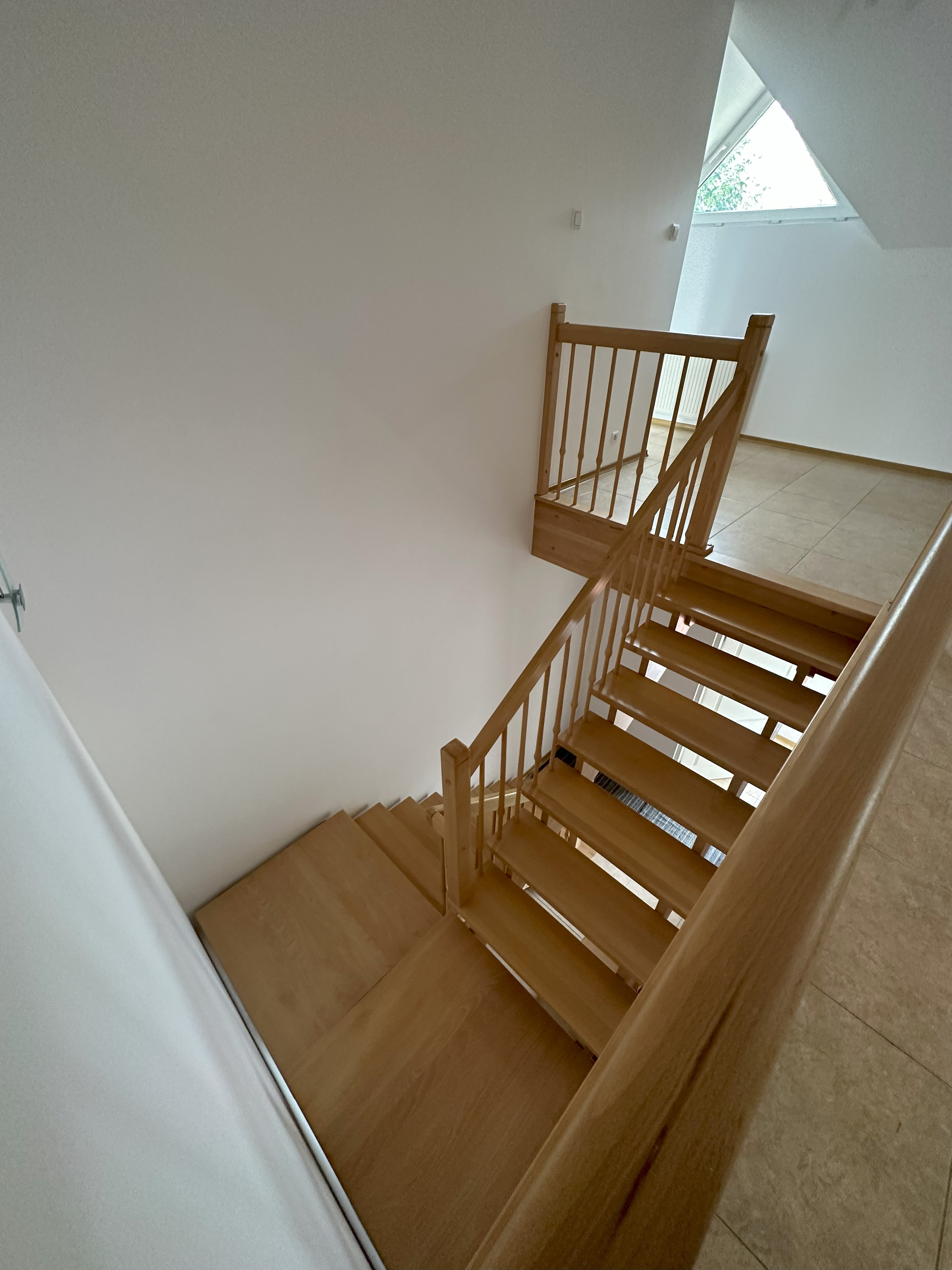 Na podłodze w pokojach płytki oraz panele, w łazienkach płytki, schody na piętro drewniane.