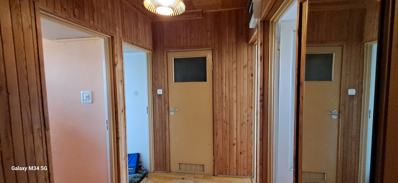 Okna Pcv, na podłodze parkiet, w łazience płytki. W przedpokoju boazeria oraz pawlacz i szafa.