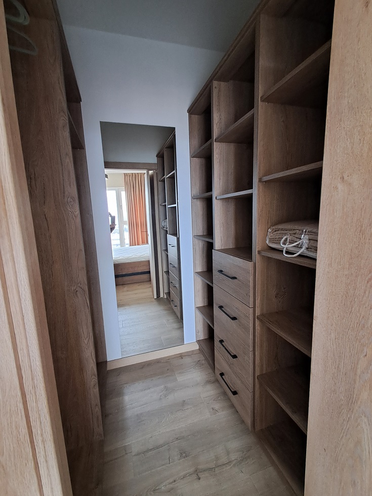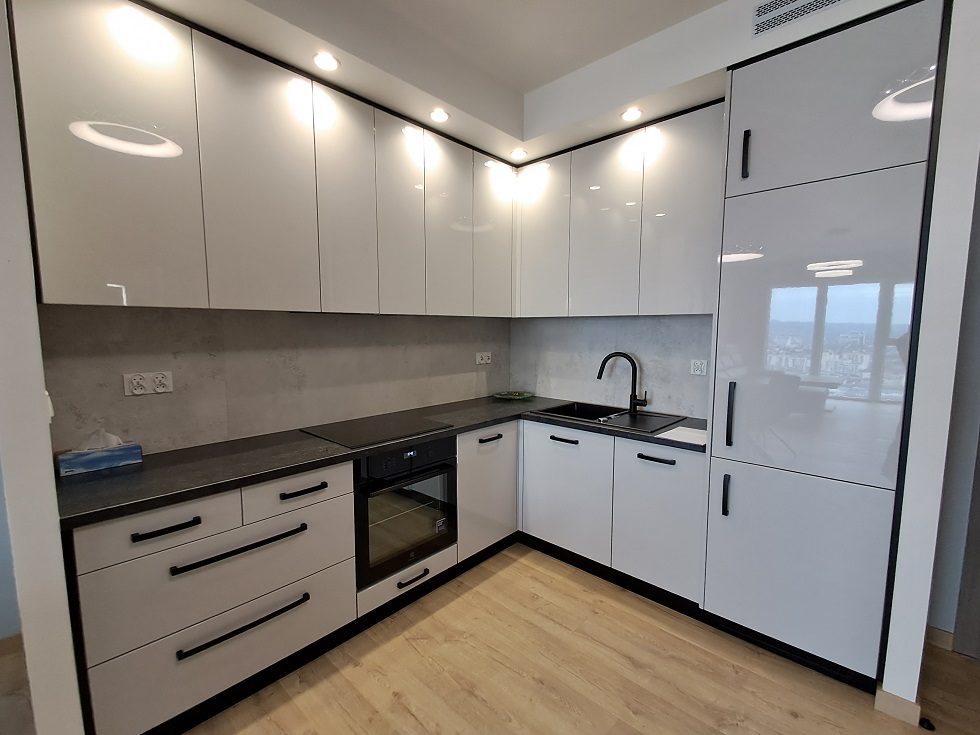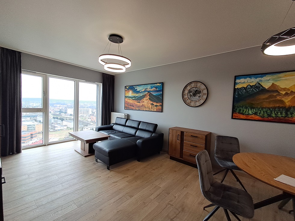 Mieszkanie jest w pełni umeblowane i wyposażone w sprzęty AGD i RTV (telewizor, pralko-suszarka, zmywarka, płyta indukcyjna, piekarnik, lodówka) oraz drobne sprzęty: deska do prasowania, żelazko, odkurzacz. W kuchni sztućce, talerze, kubki.